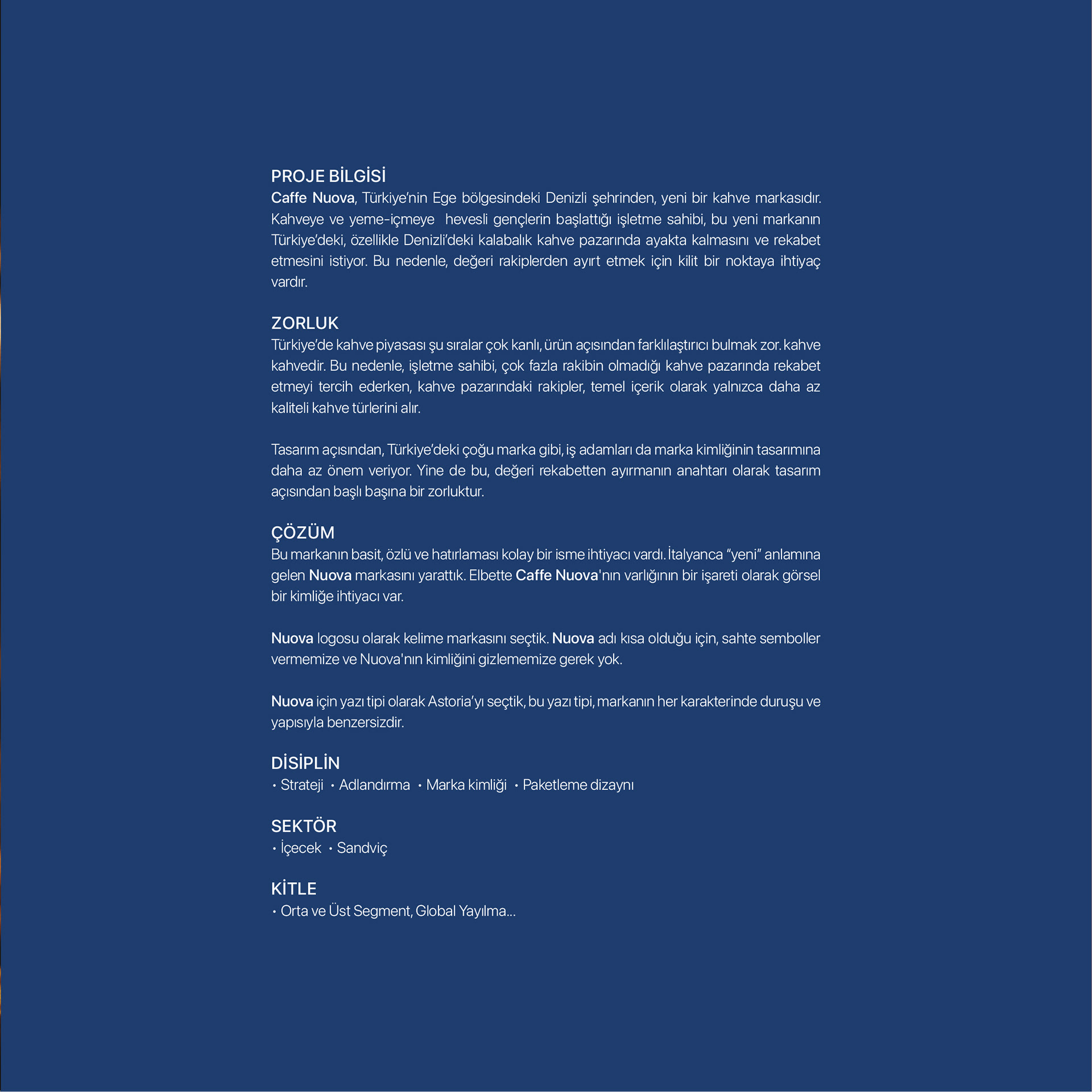 Proje Bilgisi: Caffe Nuova, Türkiye’nin Ege bölgesindeki Denizli şehrinden, yeni bir kahve markasıdır. Kahveye ve yeme-içmeye hevesli gençlerin başlattığı işletme sahibi, bu yeni markanın Türkiye’deki, özellikle Denizli’deki kalabalık kahve pazarında ayakta kalmasını ve rekabet etmesini istiyor. Bu nedenle, değeri rakiplerden ayırt etmek için kilit bir noktaya ihtiyaç vardır.